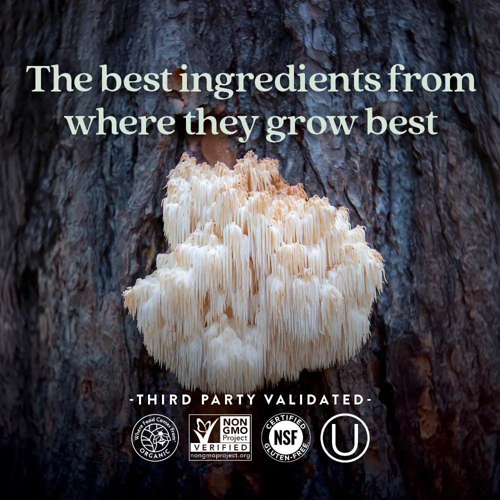 Quality standards — 100% grown in the USA; Made with Certified Organic Lion’s Mane; Non-GMO Project Verified; Certified Vegan; Certified Kosher; NSF Certified Gluten-Free