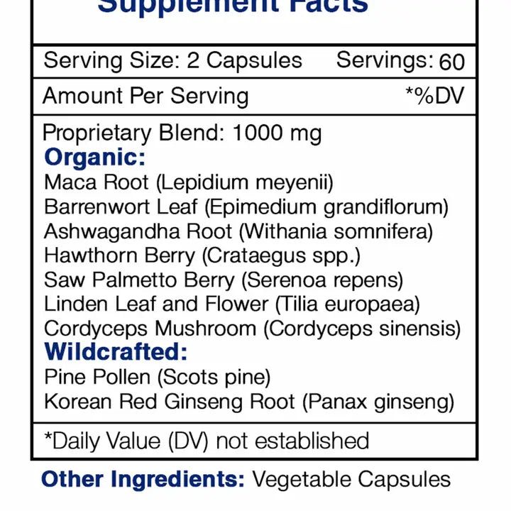 Key Botanicals: Pine Pollen, Maca, Korean Red Ginseng, Saw Palmetto, Barrenwort (Horny Goat Weed), Ashwagandha, Linden, Hawthorn, Cordyceps.